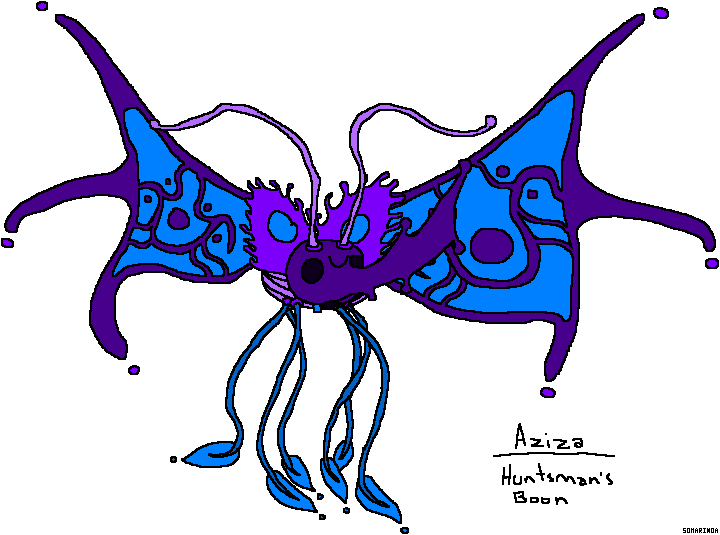 The Aziza can appear in any regular or fairy forest in the game, but will generally only do so at random and uncommon times. They will buff the area around them, and thus if a player stands close enough to them they can receive its Agility and Speed increasing buff. They can be killed in this game, but this will not benefit the player to do so, though their horn may drop as a weapon and their elytra (wing cases) can drop as a shield. If attacked in this game they will defend themselves either by slipping into an alternate dimension (of which they will eventually emerge somewhere else on the field) or they will electrify their foe with their streaming tendrils.